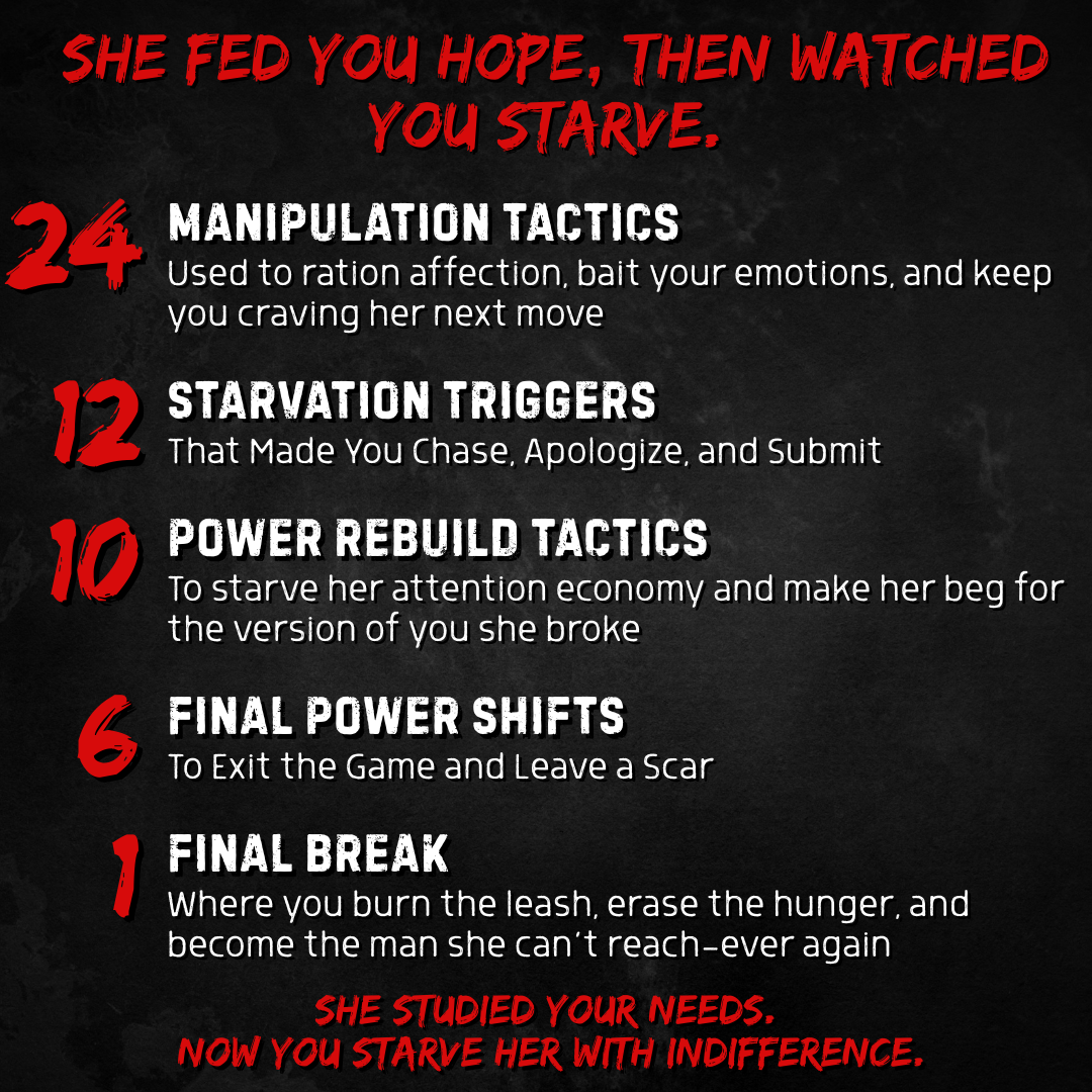 This book breaks the psychology behind her every move. You’ll learn to read her timing, decode her silences, and stop feeding her control. You’ll rebuild your value frame until she’s the one starving—and you’re the one in control.